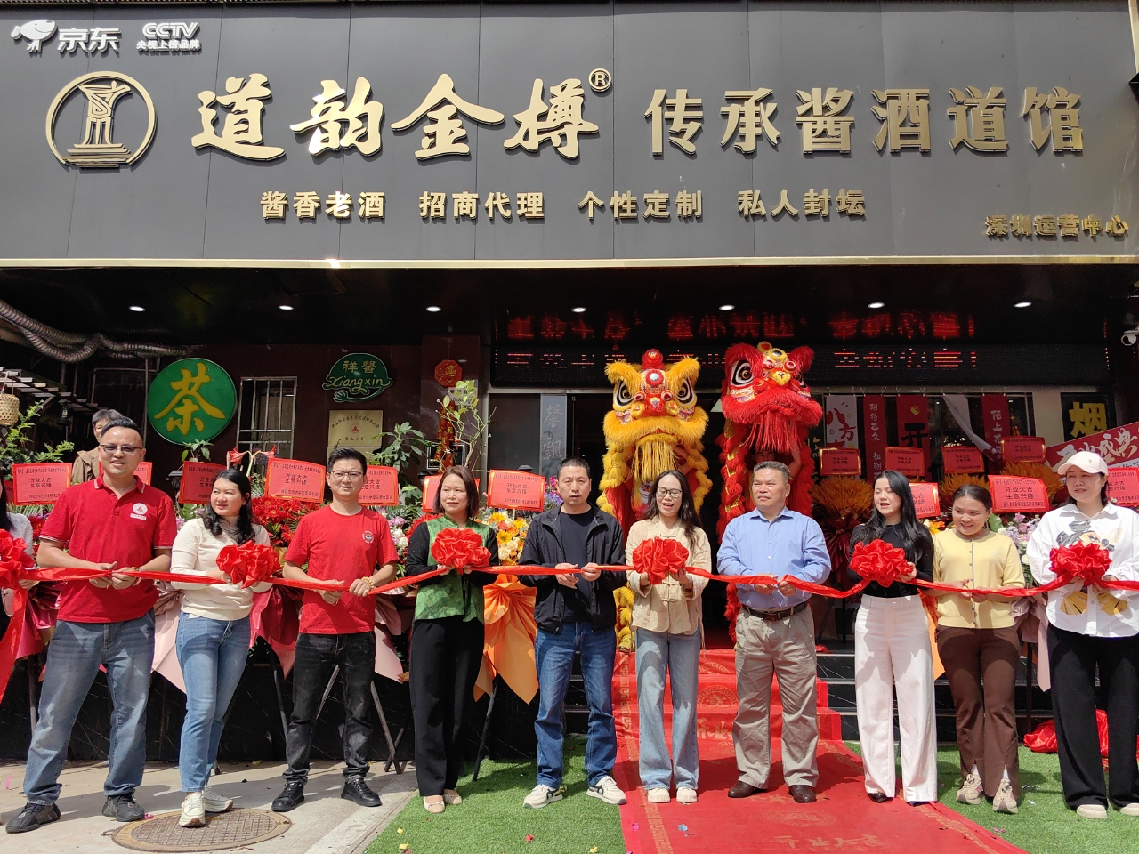 开业现场喜气洋洋,热闹非凡,深圳校友会2003自动化校友,粤金樽酒业运营总监、智高星科技总经理、深圳校友会副会长/第三分会会长黄志高对深圳校友会校友代表一行的到来表示热烈欢迎,并邀请执行会长黄协盛一同为祥馨·道韵金樽传承茶酒道馆开业剪彩。