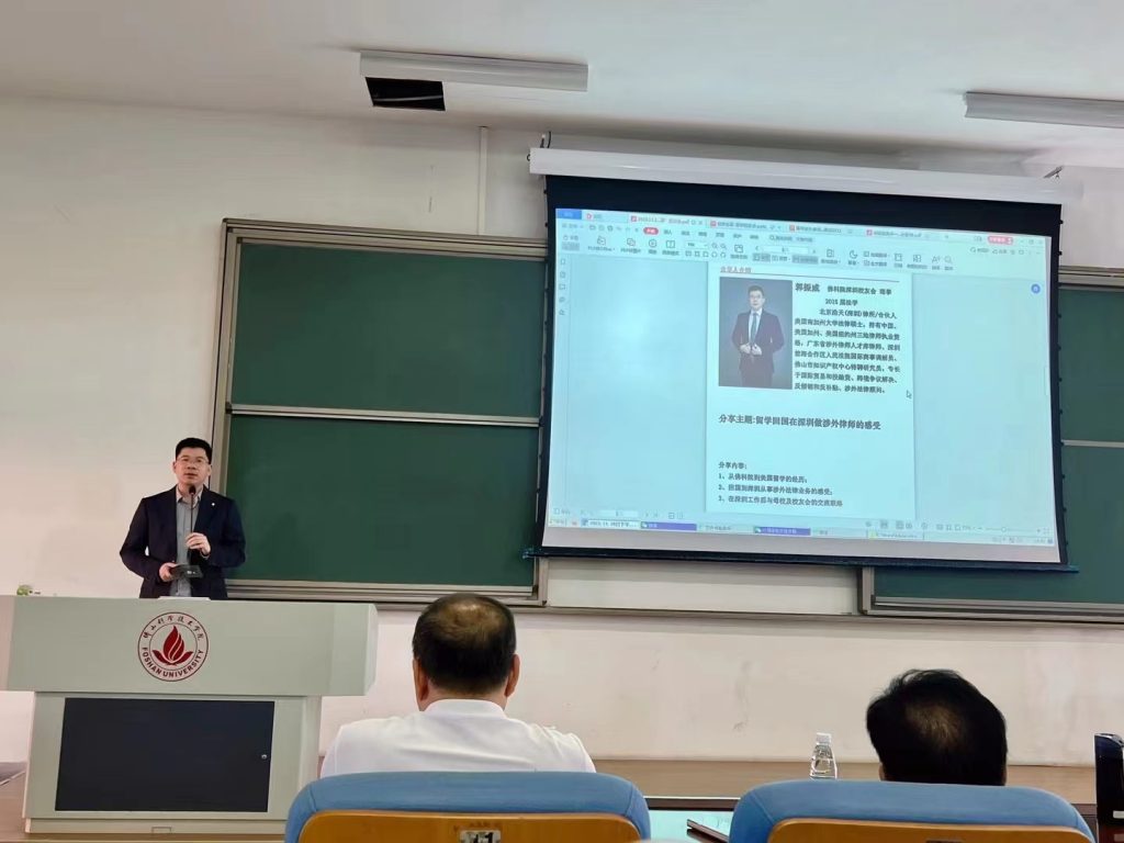2015届法学毕业生校友郭振威,是北京浩天(深圳)律所合伙人,持有中国、美国加州、美国纽约州三地律师执业资格,广东省涉外律师人才库律师、深圳前海合作区人民法院国际商事调解员、佛山市知识产权中心特聘研究员。专长于国际贸易和投融资、跨境争议解决、反倾销和反补贴、涉外法律顾问。他分享了自己从学校毕业后,留学美国南加州大学攻读下来法律硕士,回国在深圳做涉外律师的感受。为到场同学的未来发展指出了一条新的发展路径。