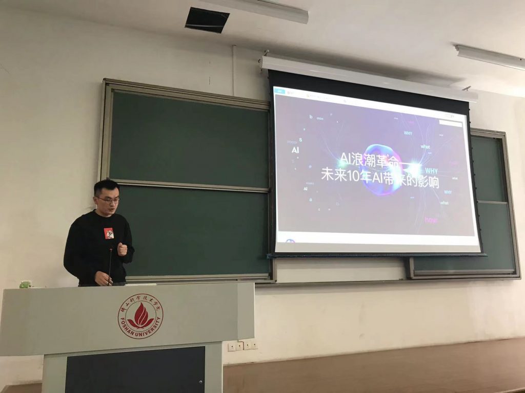 2013届机械设计制造及其自动化专业毕业生校友王泽楷,是深圳市创立言图智能创新有限公司联合创始人,他分享了人工智能浪潮革命的最新行业动态,让同学们聆听了他关于未来10年AI带来的影响的独到见解,开拓了眼界,他还就在校学生应该如何参与其中阐述了个人观点。